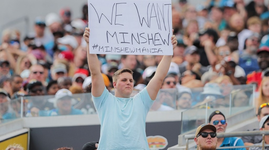 Minshew Mania ยังมีชีวิตอยู่อีกครั้งใน Jacksonville เร็วกว่าที่คาดไว้หลังจากที่กองหลัง Nick Foles ในการแข่งขันวันอาทิตย์ระหว่างเสือจากัวร์และแทมปาเบย์ไฮเวย์กับแฟน ๆ